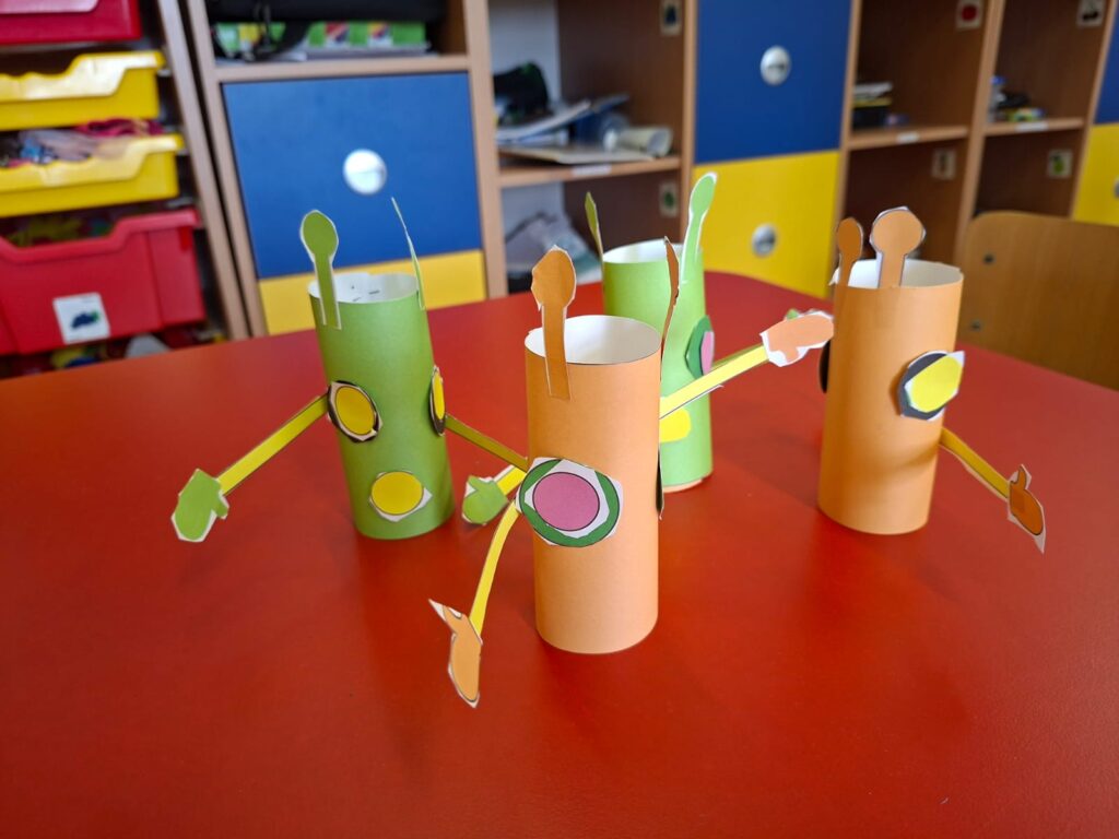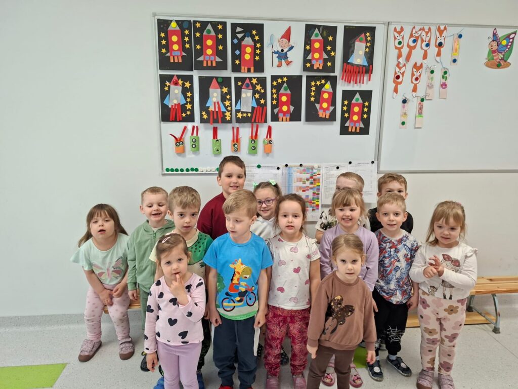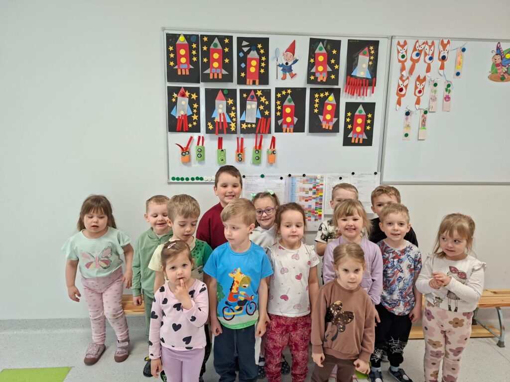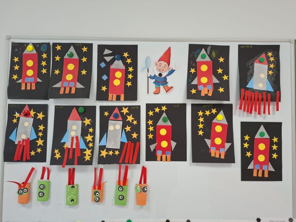 Grupa „Motylki” wykonała pracę plastyczną „Przybysze z obcej galaktyki”, rozwijając wyobraźnię i kreatywność.
