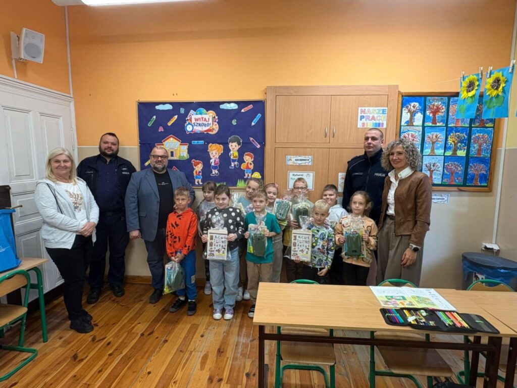 W klasie pierwszej odbyło się spotkanie z Panią Burmistrz Małgorzatą Adamczak, Panią Danutą Szczepaniak, kierownikiem Wydziału Oświaty, oraz Policjantami z Posterunku w Śmiglu. Rozmowa dotyczyła bezpieczeństwa na drodze. Dzieci dowiedziały się, jak prawidłowo przechodzić przez jezdnię, dlaczego warto nosić odblaski i jak zachowywać się w pobliżu ulic.
