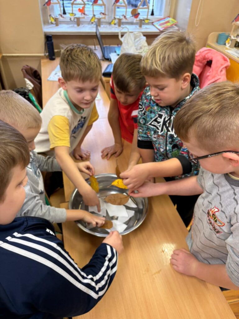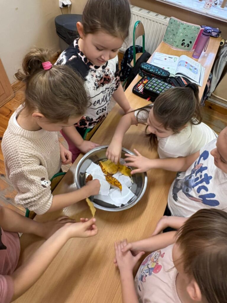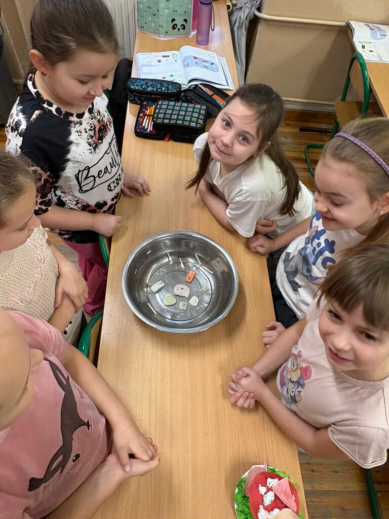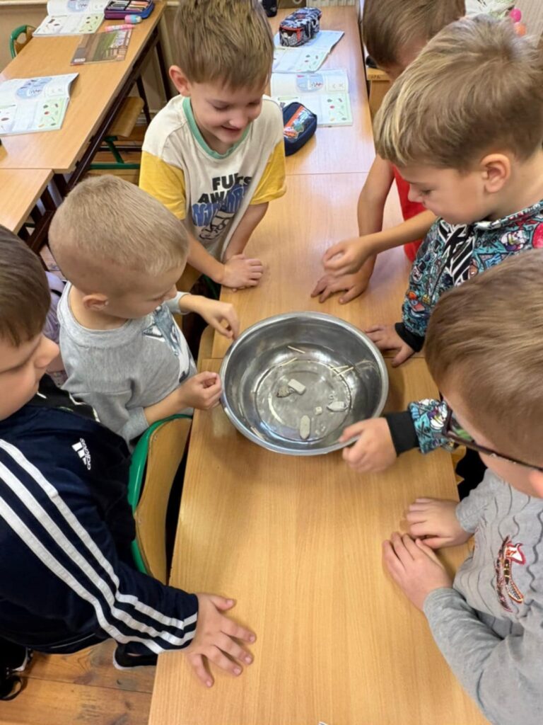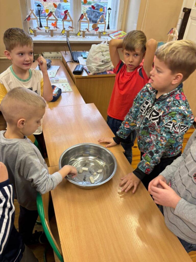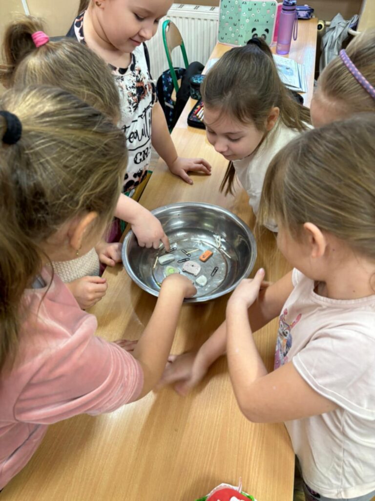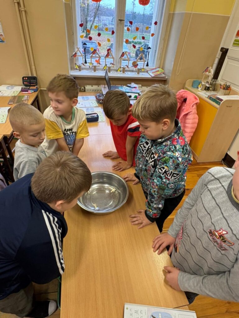 Robiliśmy eksperyment, w którym sprawdzali, co pływa w wodzie, a co tonie. Wykorzystaliśmy liść, papier, monetę, jabłko i kilka innych przedmiotów. Podczas zabawy dzieci odkryły, że wiele rzeczy pochodzących z roślin unosi się na wodzie, a przedmioty z metalu, np. moneta, od razu opadają na dno.