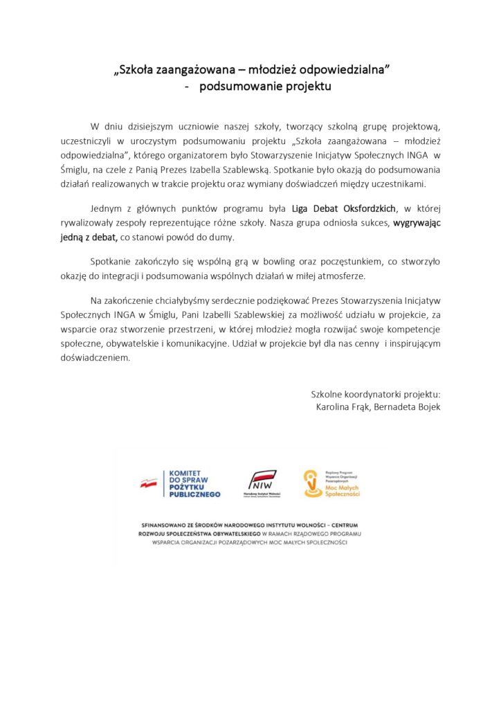 „Szkoła zaangażowana – młodzież odpowiedzialna” – podsumowanie projektu