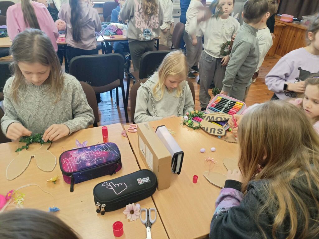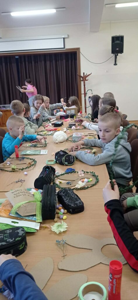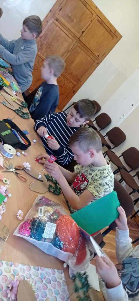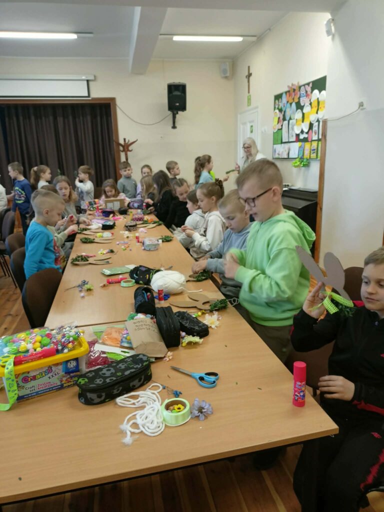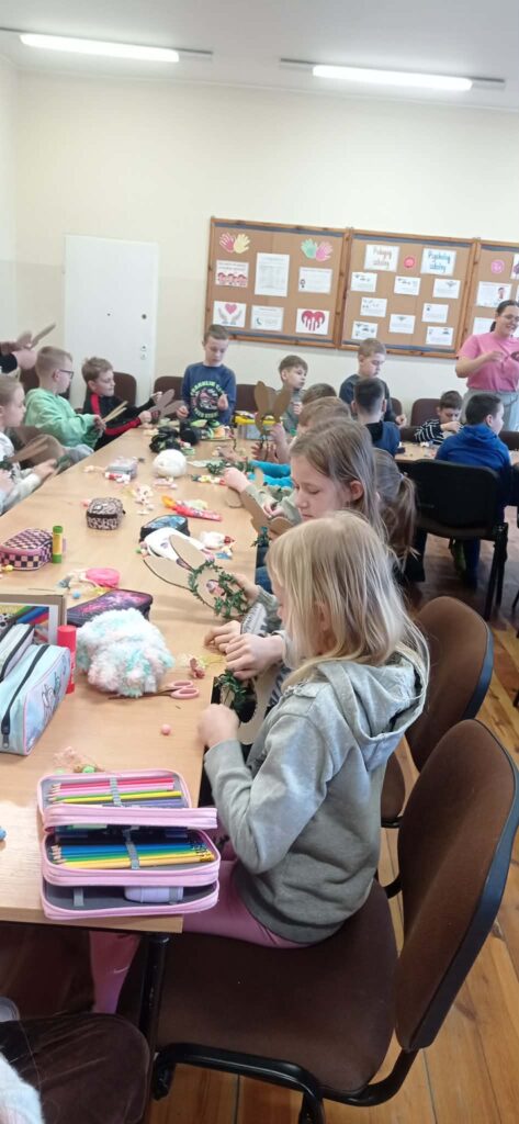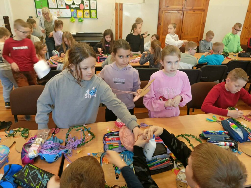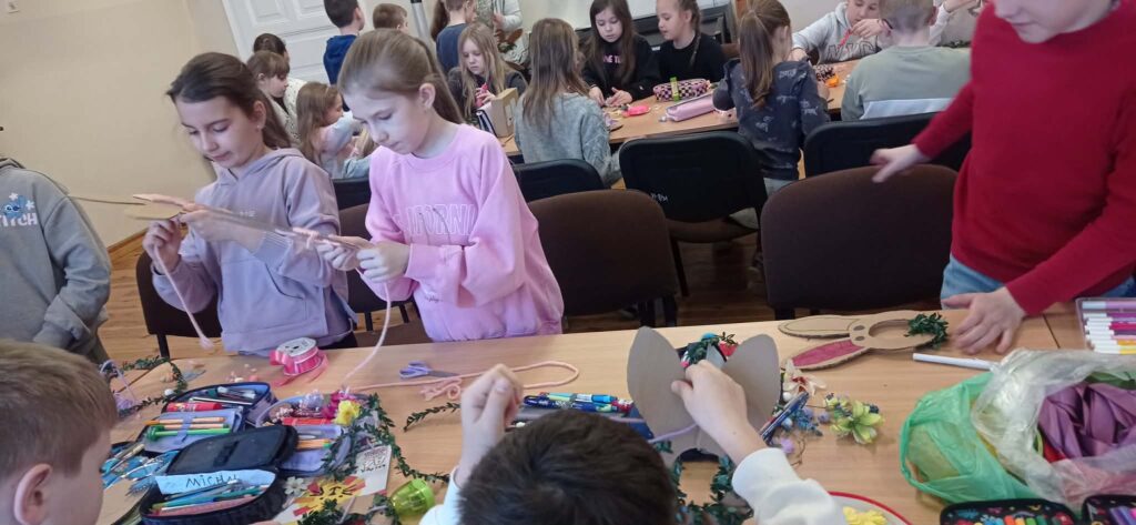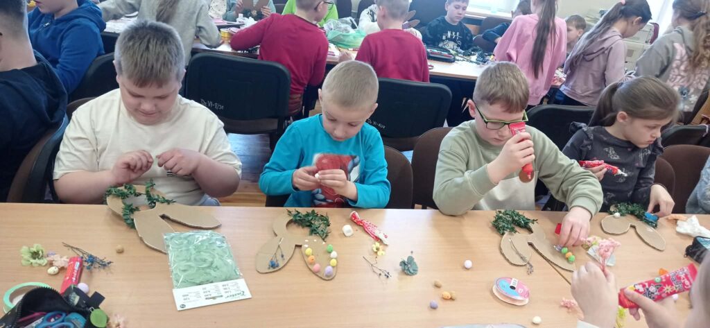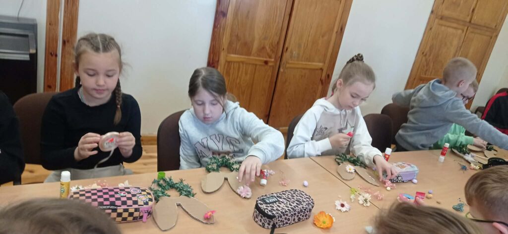 Głównym zadaniem było stworzenie wielkanocnych wianków, które dzieci z wielką starannością dekorowały przy pomocy: