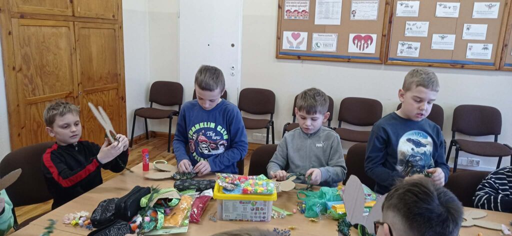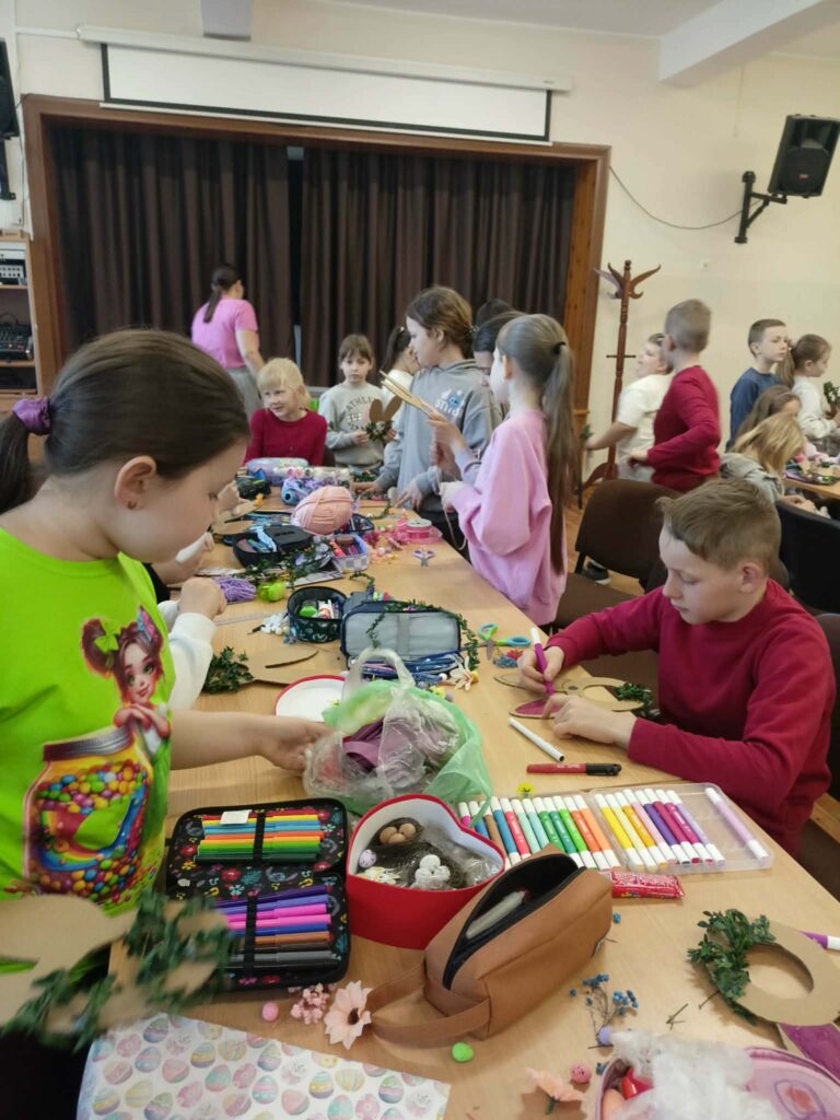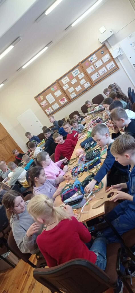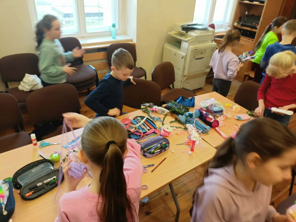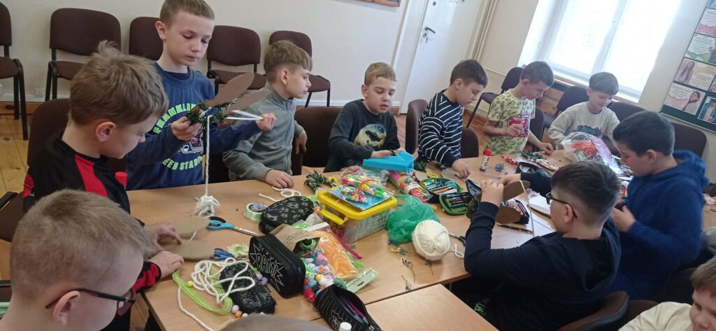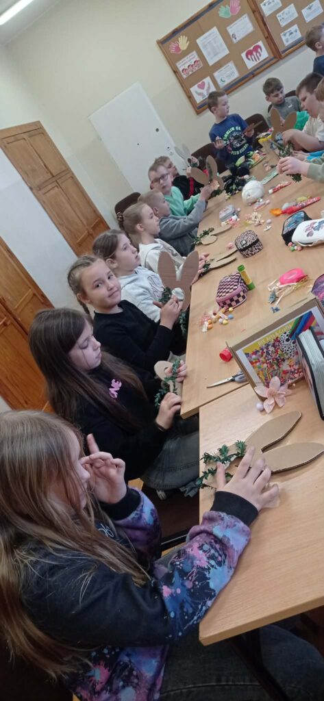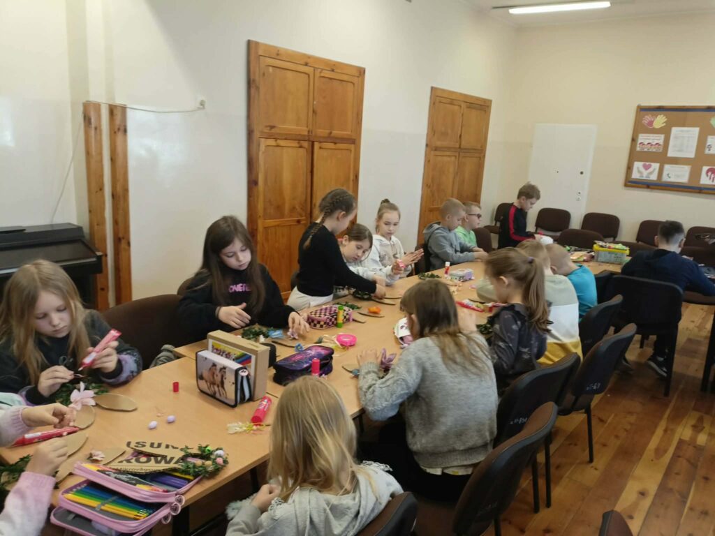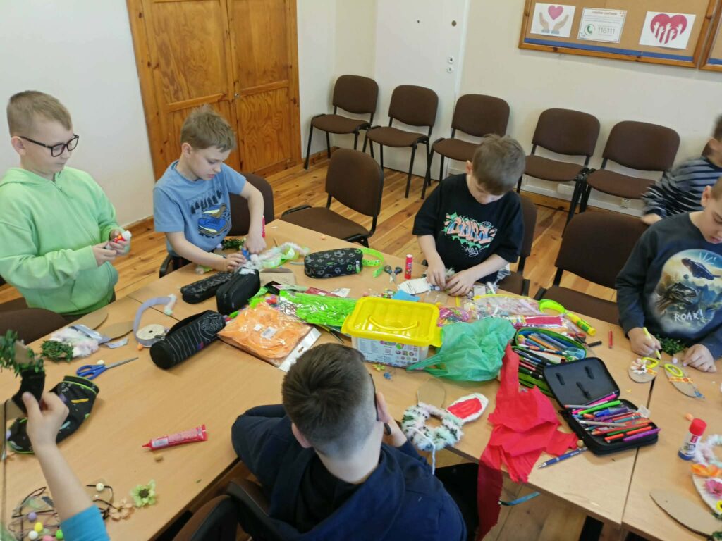 Głównym zadaniem było stworzenie wielkanocnych wianków, które dzieci z wielką starannością dekorowały przy pomocy:
